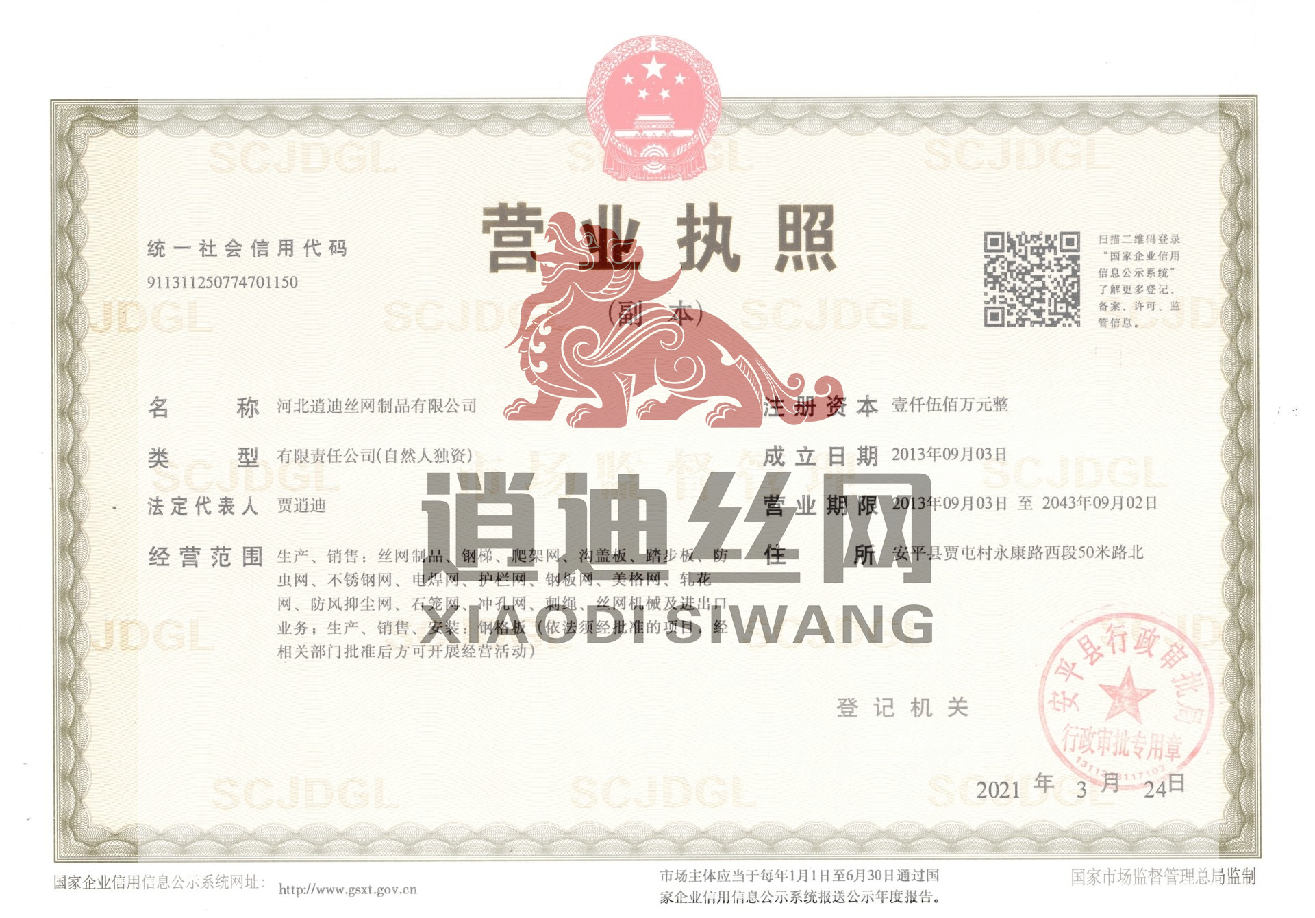 河北逍迪絲網(wǎng)制品有限公司誠信天下,誠信是我們公司一個原則問題不可撼動的,以心中有誠信的思想結(jié)交五湖四海的朋友,能達(dá)到雙贏是最好的,我們堅(jiān)信朋友多了路好走,我們公司都是老朋友多,我們一直是這樣做的。河北逍迪絲網(wǎng)制品有限公司成立于2013年注冊資本壹仟伍佰萬整,主要生產(chǎn)沖孔網(wǎng),鋼格板,金屬防蟲網(wǎng),如實(shí)的實(shí)體廠家,是一家-研發(fā)-銷售-生產(chǎn)-安裝-售后一條龍公司,2019年通過了ISO 9001認(rèn)證管理體系符合GB/T 19001-2016/ISO 9001:2015標(biāo)準(zhǔn),同時通過了SGS認(rèn)證,擁有商標(biāo)版權(quán)2品牌,擁有一個著作版權(quán),河北逍迪絲網(wǎng)制品有限公司位于中國有名的(絲網(wǎng)之鄉(xiāng))安平縣,于天津,北京,雄安,石家莊相鄰,交通非常發(fā)達(dá),出口可以選擇天津港口非常近每天都有接貨送貨往返車輛,空運(yùn)可以選擇石家莊正定機(jī)場,附近也有鐵路運(yùn)輸,當(dāng)?shù)剡€有兩個生態(tài)物流園區(qū)發(fā)往全國各地,我們沖孔網(wǎng)工廠生產(chǎn)設(shè)備有:普通沖壓機(jī),高速沖壓機(jī),自主研發(fā)小微孔沖壓機(jī),龍門沖,磚塔沖孔,重型沖孔機(jī),萬瓦級別激光切割機(jī),3000W激光切割機(jī),焊接設(shè)備,折彎機(jī),校平機(jī),剪板機(jī),精密校平機(jī),(對板面平整度要求苛刻的客戶群體0.5-0.2誤差)我們公司銷售市場沒有局限性國內(nèi)國外都供應(yīng),擁有出口權(quán)...